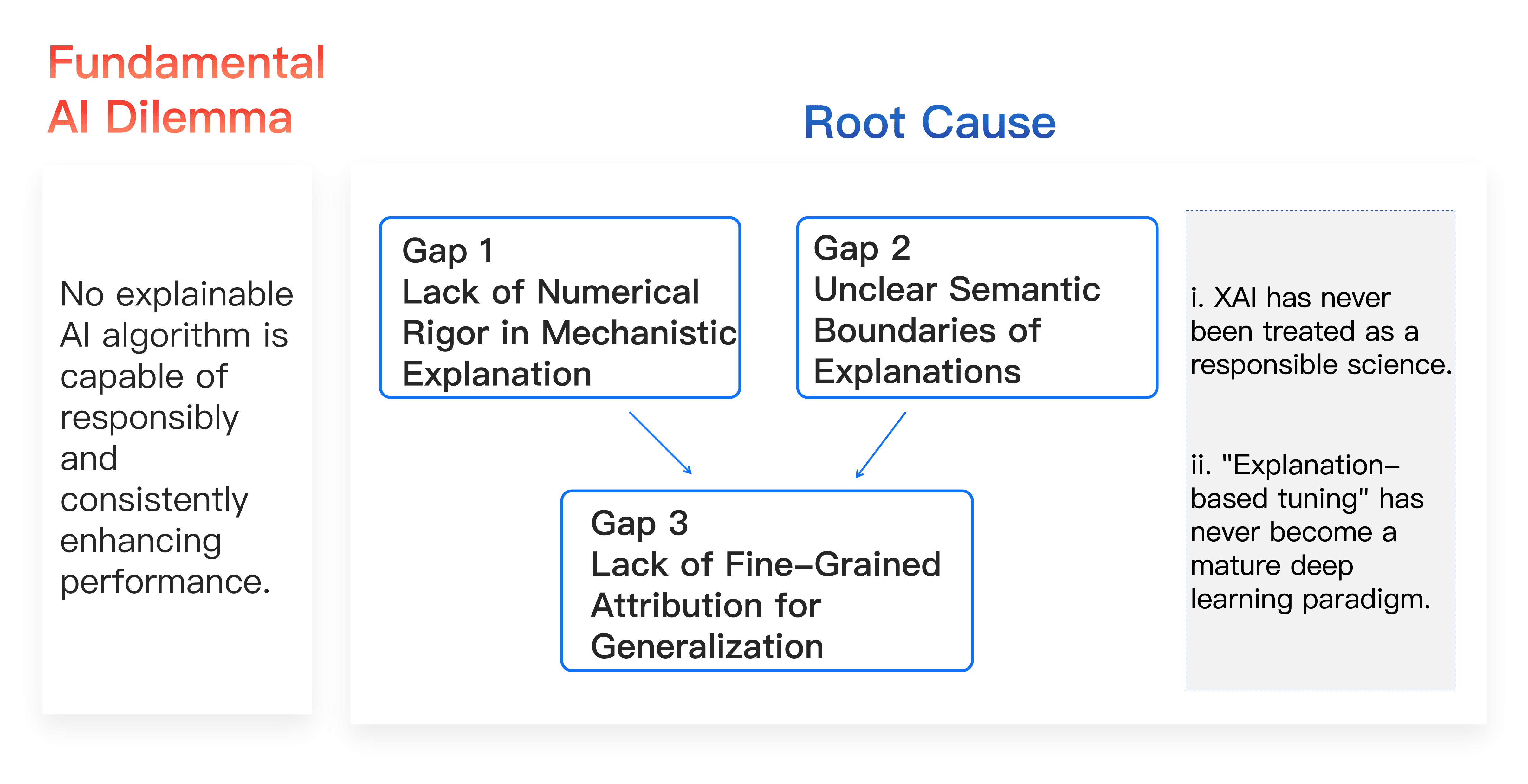 ⭐️ Bottleneck 2: The incapacity of traditional theories to explain root causes of large model performance. As traditional generalization analysis methods based on feature space gradually decline in the era of large models, explaining the fundamental reasons that determine large model performance (generalization, robustness) is impossible. Essentially, the unavoidable developmental barrier in the interpretability domain can be distilled into a fundamental scientific question: Is it possible to rigorously and comprehensively explain the representation logic and performance of neural networks through concise symbolic logic? More precisely, under what conditions can symbolic logic concepts rigorously explain the various detailed decision mechanisms modeled by neural networks and overall model performance? Beyond the applicant team, no serious theoretical modeling has been undertaken internationally to address this question.